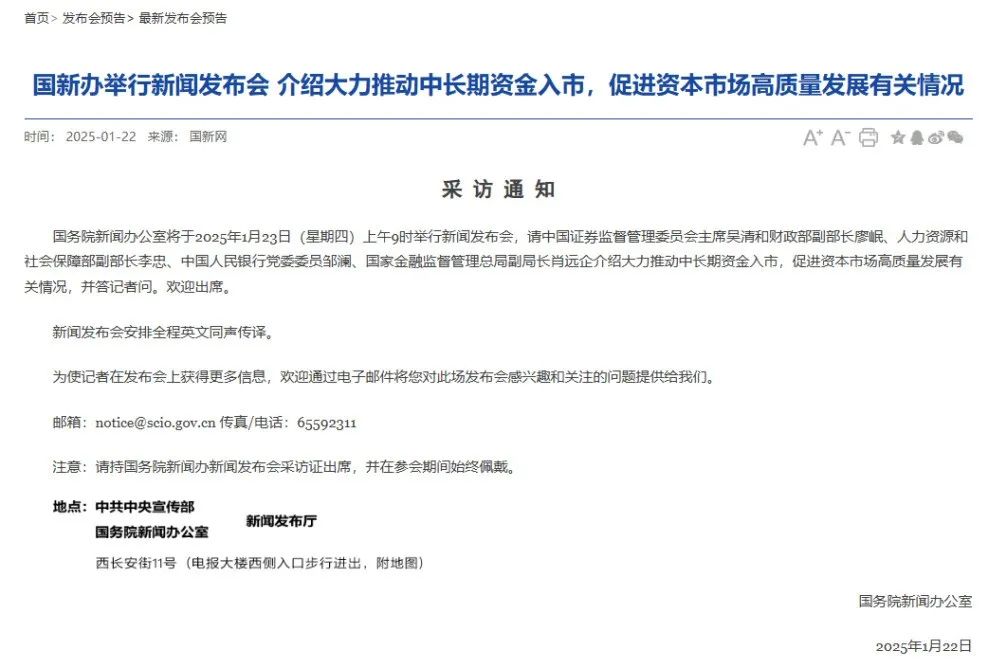 你的位置:168飞艇大神计划技巧 > 产品展示 > 预告!国新办明天9时将举行新闻发布会据国新办官网发布,国务院新闻办公室将于2025年1月23日(星期四)上午9时举行新闻发布会,请中国证券监督管理委员会主席吴清和财政部副部长廖岷、人力资源和社会保障部副部长李忠、中国人民银行党委委员邹澜、国家金融监督管理总局副局长肖远企介绍大力推动中长期资金入市,促进资本市场高质量发展有关情况,并答记者问。